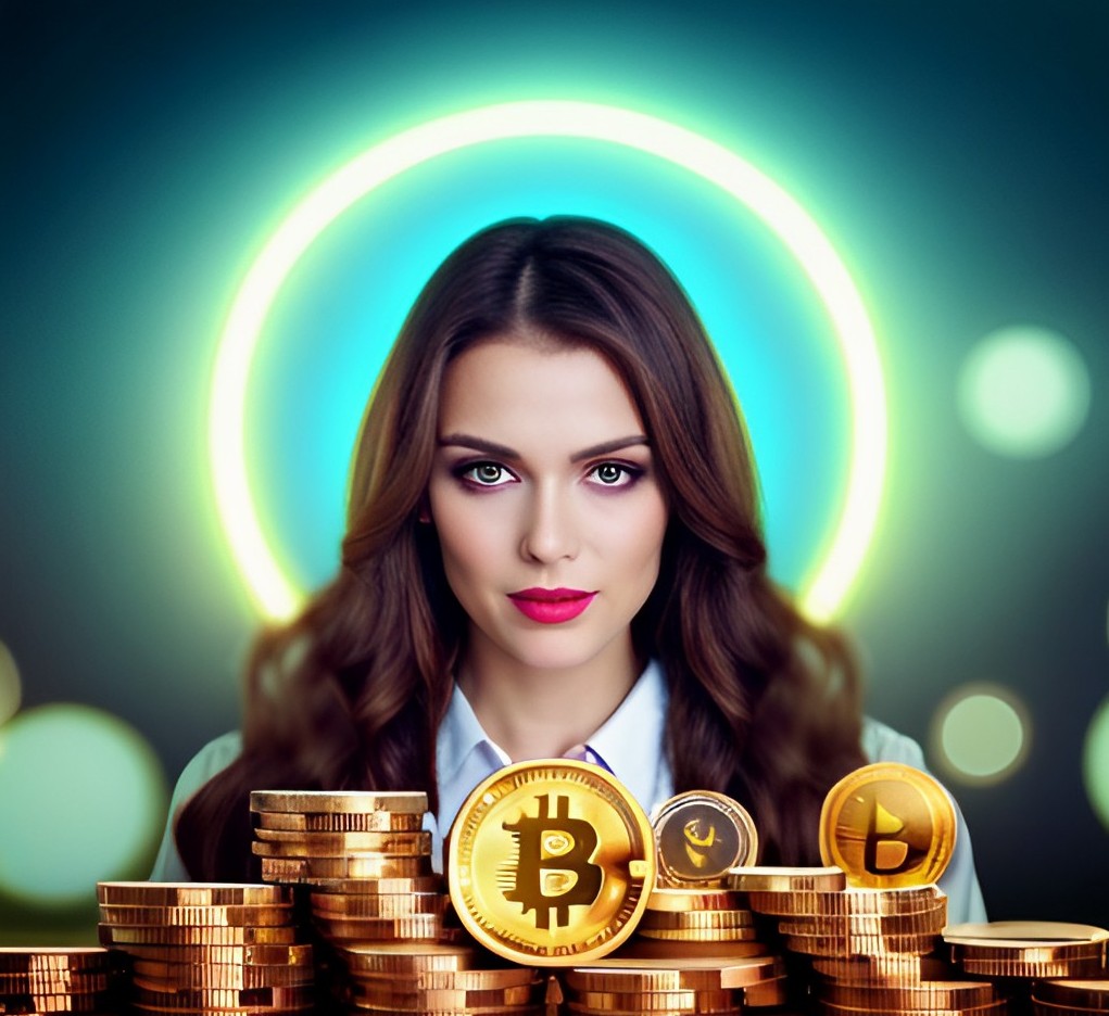 A beautiful girl is thinking while depicted cryptocurrency is in front of her.